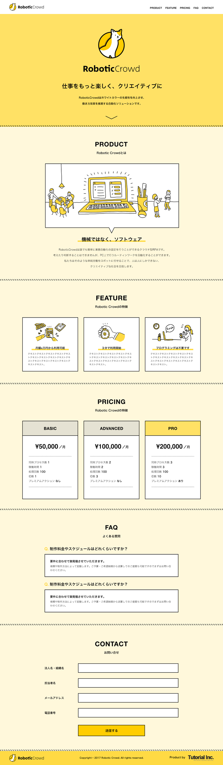 Robotic Crowdというクラウド型RPAのロゴからランディングページのデザインを制作しました。 デザイン内のイラストも自身で描いています。