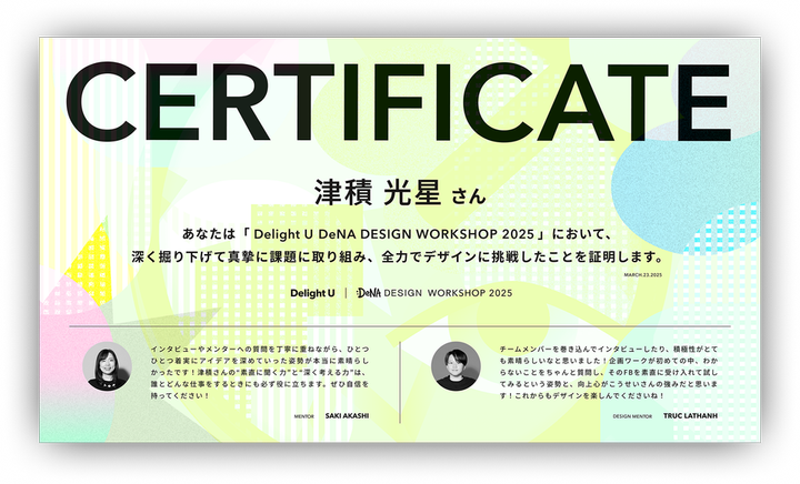 株式会社DeNAのデザインワークショップ「Delight U 2025」に参加した際に制作した際にいただいた修了証です。ワークショップ全体を通したFBを2名の社員の方々からいただきたきました。(FBは添付画像下部に記載)