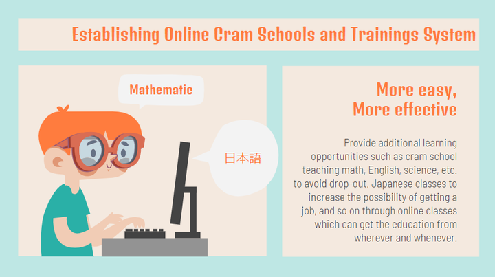 ネパールの教育問題で一番大きな課題となるのは、学校の不足だということを知り、オンラインで勉強できるシステムの導入を提案しました。 ネパール人の団体の方々と英語で企画を練り、プレゼンテーションも英語で行いました。