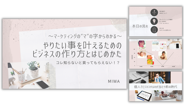 上記のLPで案内していたマーケティング講座の資料。 女性やママさんがターゲットであり、マーケ初心者の方でも力まないような構成やデザインにすることを心がけました。 私自身で本格的に初めて制作した講座資料でしたが、受講者の方からは内容はもちろん、資料のデザインがかなり好評でした。