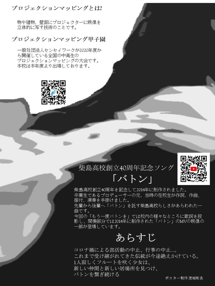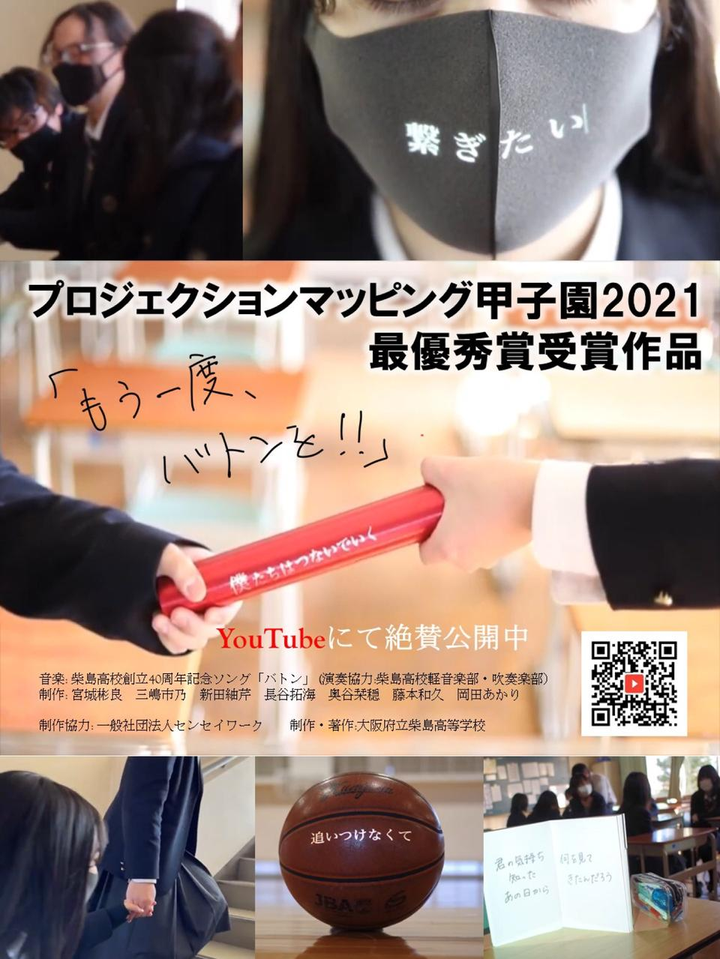 柴島高校内でプロジェクションマッピングの制作チームを立ち上げ、過去に制作された「バトン」の楽曲に合わせたプロモーションビデオをプロジェクションマッピングを用いて校内の様々な場所に投影し制作しました。 【担当業務】 プロジェクト全体の管理 特設サイト、ポスター制作 映像制作(一部) 制作協力:一般社団法人センセイワーク 制作・著作:大阪府立柴島高等学校「もう一度バトンを!」製作委員会