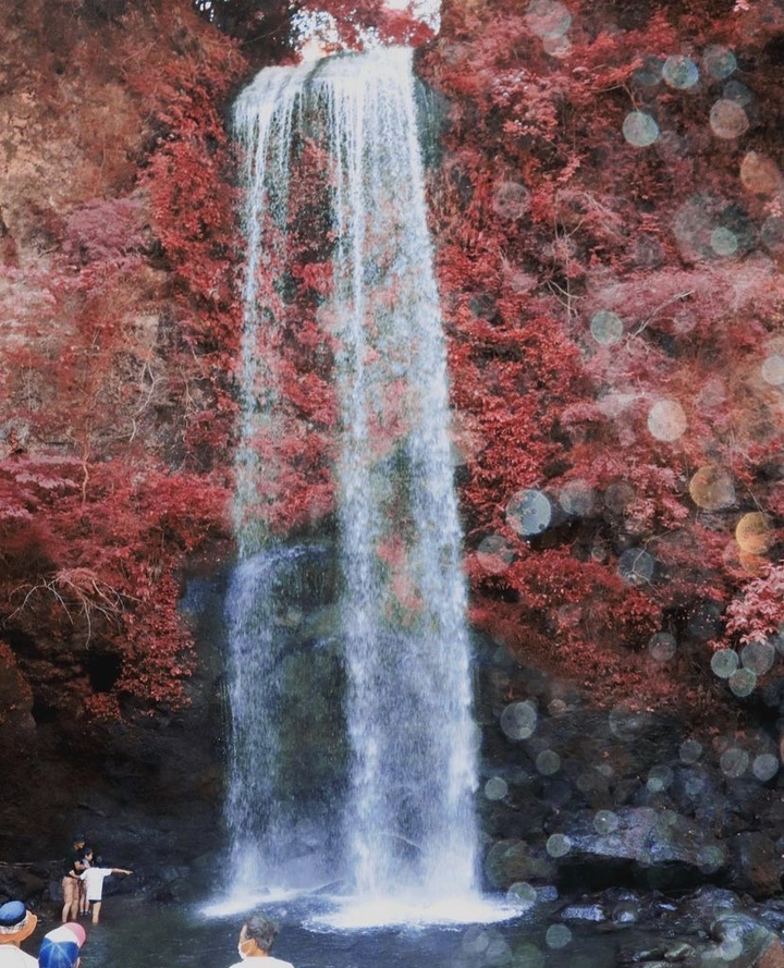 キャンプに行った際にとった滝の写真。 緑の葉っぱをあえて赤にすることで、 独創的な世界観を意識しました。