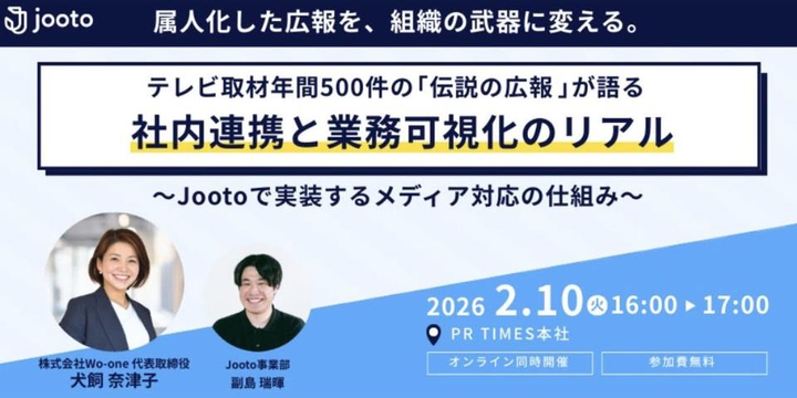 「伝説の広報」と称される株式会社Wo-one代表 犬飼氏をゲストに招き、Jootoを活用した広報業務のDXをテーマにしたセミナーを企画・開催。 当日はモデレーターとして登壇。 会場:22名 オンライン:128名 計:150名の集客