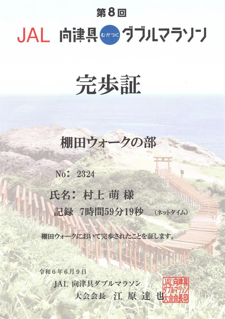 第8回 JAL 向津具ダブルマラソン 棚田ウォークの部 完歩証