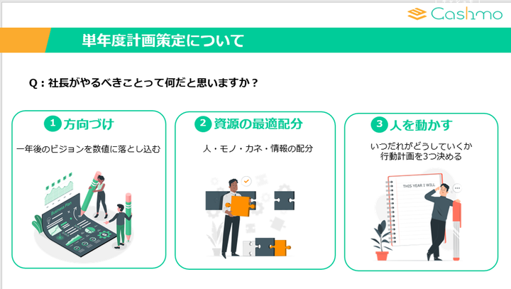 「経営者が本来やるべきことができていない」 そんな本質に気付いていただくために’’そもそも経営者がすることとは何か’’を社長ご自身で考えていただき、キャシュモの魅力や必要性を感じていただいています