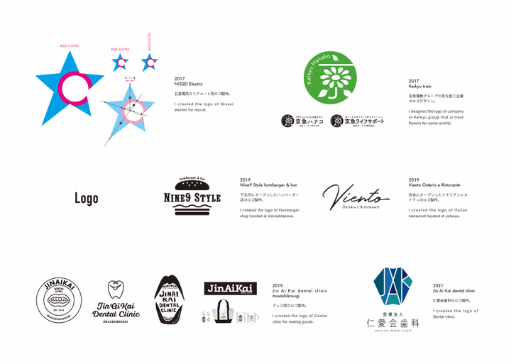 2017 Keikyu train 京急電鉄グループの花を扱う企業のロゴデザイン。 I designed the logo of company of Keikyu group that is treat flowers for some events. 2017 NISSEI Electric 日星電気のリクルート用ロゴ製作。 I created the logo of Nissei electric for recruit. 2019 Nine9 Style hamberger & bar 下北沢にオープンしたハンバーガー店のロゴ製作。 I created the logo of Hamberger shop located at shimokitazawa. 2019 Jin Ai Kai dental clinic