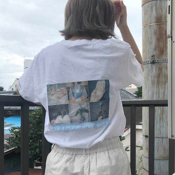 バックプリントの写真の撮影やTシャツのデザインを担当しました。表のロゴが暗闇で光るデザインで1枚1枚違うリメイクを施しました。