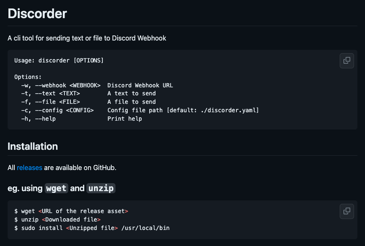 SSH環境でもログをscpせずに簡単に閲覧したいと言うニーズで、Discordにstdinやfileなどから送れるcliツールを作成しました。 Rust製で、内部実装にclapやreqwestなどが含まれます。