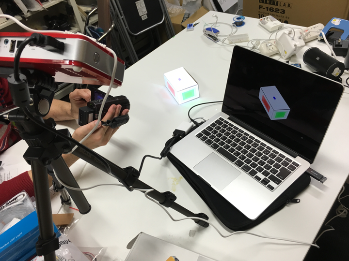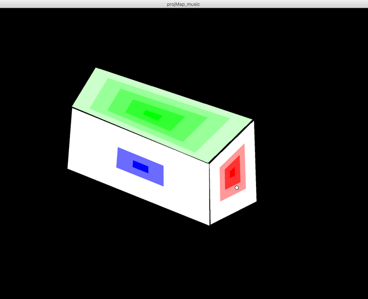 プロジェクションマッピングの基本的なプログラム。プロジェクターで箱に映像を映すプログラムを制作した。このプログラムは音の成分を読み取って赤、緑、青の四角形に変換される。それらの四角形を描画する範囲を手動で計測して箱に映像を映している。