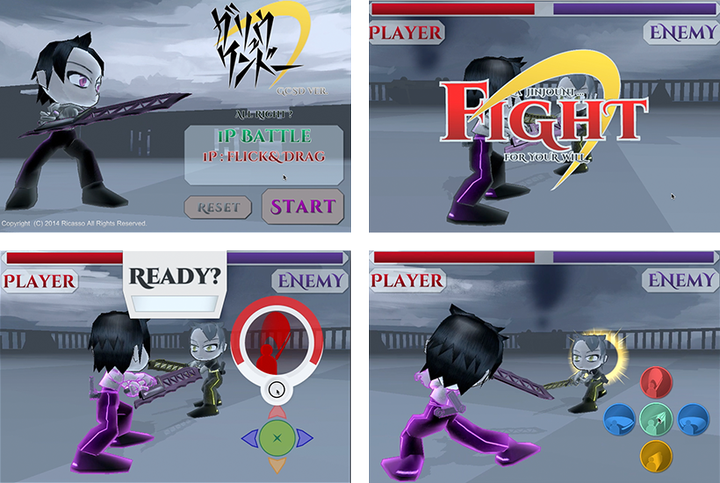 大学院在学中から個人で制作していたUnityゲーム処女作。 1vs1のチャンバラ格闘アクションゲーム。 スマートフォンゲーム操作UIの理想を自分なりの解釈で実装し、モーション・BGM・キャラクターモデリングなど、自分の好きな要素を詰め込み自作した。 Unity就職大作戦(第一回・2014年)では、ファイナリストとして登壇・プレゼンし、 1社から第二面接通過権を獲得した。