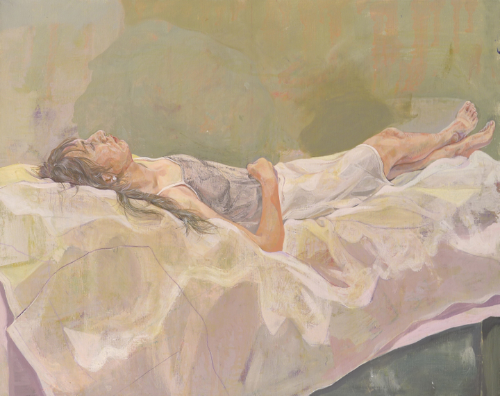 横たわる少女を描いた油絵です。