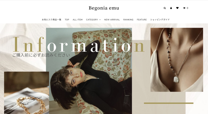 Begonia emu 女性らしさの中に強さもある、洗練されたアイテムを多数取り揃える。 上記、ECサイト制作のプロジェクトディレクションを担当。