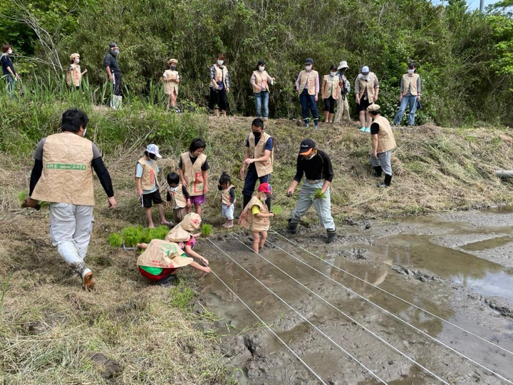 米袋を使って色々な製品が縫えたので、米も作ってしまえとばかりに、みんなで米袋ベストを着て、田植えをしました。