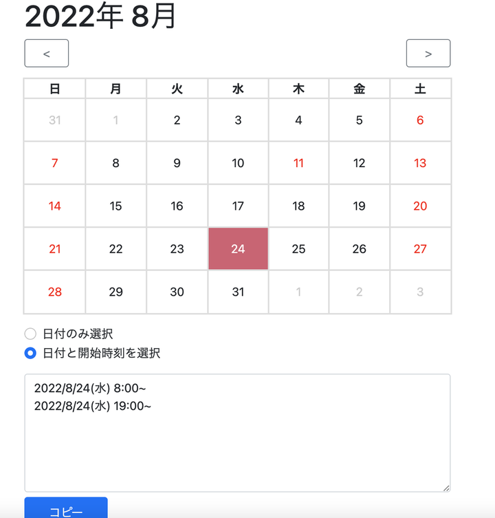 # 概要 日程調整ツールの「調整さん」への入力をラクにするためのテキストジェネレーターです。 「調整さん」自体は時間について手打ちで編集しないといけない部分が多く、面倒だったので、ボタンを押すだけで完結するようにしました。 # デモ https://schedule-text-generator.netlify.app/](https://schedule-text-generator.netlify.app/ # 使用技術 ## 言語 - TypeScript ## ライブラリ - React.js - React-Bootstrap # 開発期間 2022/04/30 ~ 2022/05/31