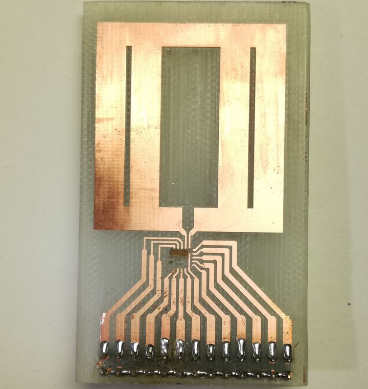 研究で実験的に制作したRFハーベスター。アナログフロントエンド・電源回路をワンチップに集積化。