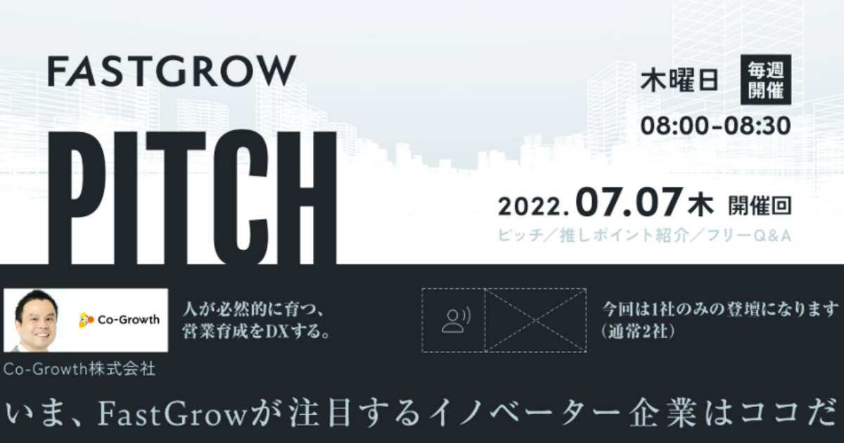 7月7日 Co-Growth株式会社がFastGrow Pitch Vol.90に参加します ~テクノロジー領域で活躍中の起業家・経営層と、若手経営人材をつなぐビジネスコミュニティ、「FastGrow」が注目するイノベーター企業として選出~