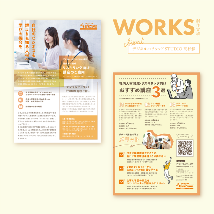 「デジタルハリウッドSTUDIO高松」様のフライヤーを制作させていただきました。 両面ともコーポレートカラーであるオレンジを使用しています。 「表面は企業向けにきちんとした印象、裏面は目を引くようなデザインで」とのことだったので、表面は社内で研修をしている様子の写真素材をメインに、テキストを直線的に区切り、なるべく読みやすいように配置しました。 裏面は少し楽しい印象になるようにイラストを複数配置したり、見出しにも色々なあしらいを施して若手社員の方にも興味を持ってもらえるよう工夫しました。