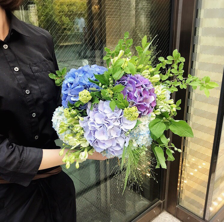 紫陽花の季節、店頭にこちらのブーケを置きました。