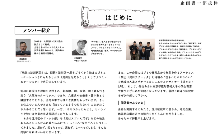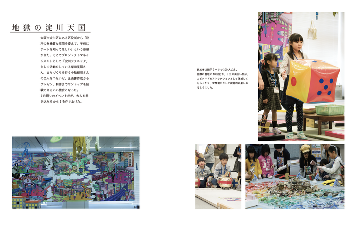 大阪市淀川区にある区役所から「役所の無機質な空間を変えて、子供にアートを知ってほしい」という依頼がきた。そこでプロジェクトマネイジメントとして「淀川テクニック」として活動をしている柴田英昭さん、まちづくりを行う中脇健児さんの2人をつないだ。 1日限りのイベントだが、大人を巻き込み0から1を作り上げた。 参加者は親子2ペアで100人ごえ。 実際に現地に10回行き、十三の面白い部分、エピソードをアトラクションとして体感してもらったり、空間演出として視覚的に楽しめるようにした。