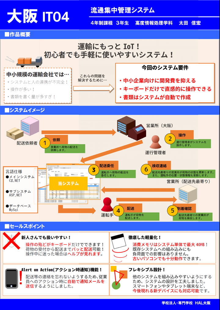 HAL大阪 就職作品プレゼンテーションでシステムを制作した際に紹介用のPOPを制作。 システムの長所だけではなく、システム全体の流れやシステム化にあたっての要件も分かりやすいように作成。 インターネットに公開されている素材を一切使用せず、 アイコン等の素材は全て自作。