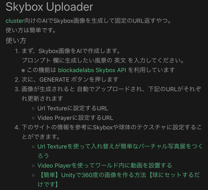 AIでSkybox画像を生成して固定のURL返す Webサービスを作成 blockadelabs Skybox API を サイトへ組み込み、プロンプトを入力する事でワールド内のSkybox が切り替わる仕組み 言語や環境 vue3 firebase - Cloud Functions - Cloud Storage