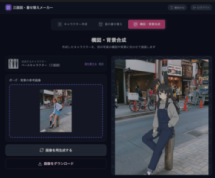 キャラクター画像をアップロードすると3面図を作成し、着せ替え や ポーズ背景合成などをするツール Google AI Studio で Gemini 3 Pro , Firebase などを利用して作成