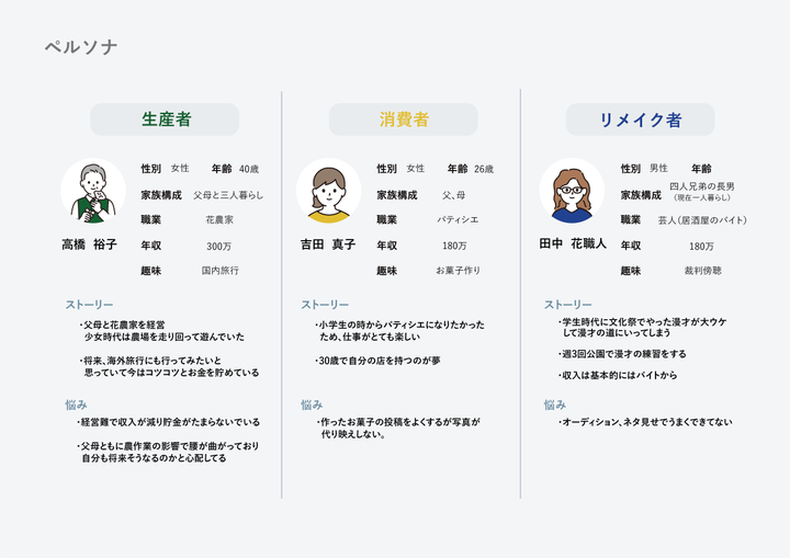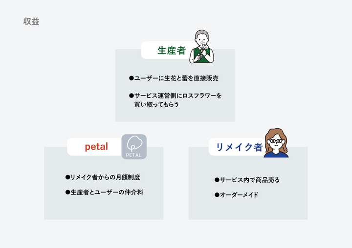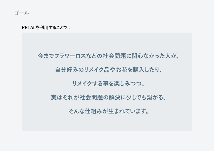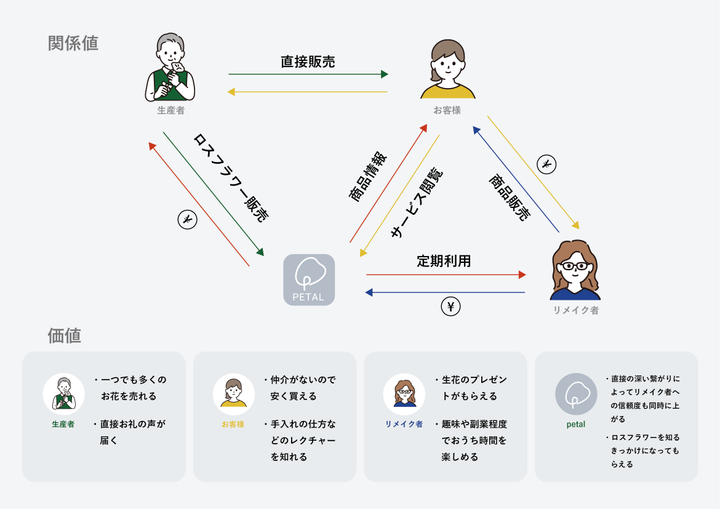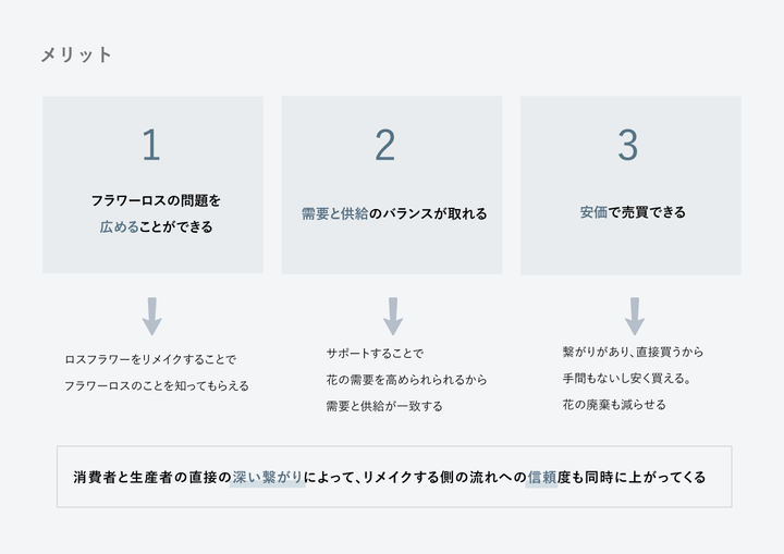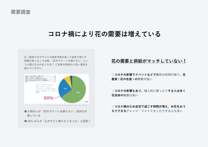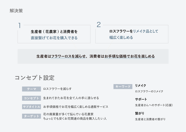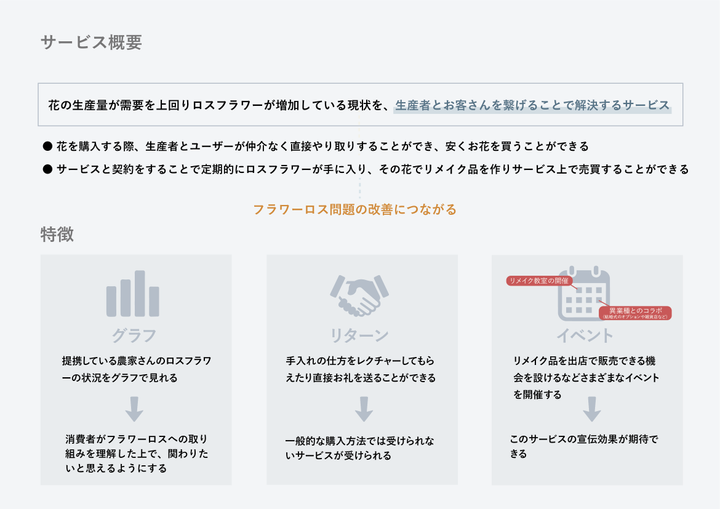 「お手頃価格でお花を幅広く楽しめる通販サービス」 花農家とユーザーを直接繋げ、お花を購入することができ、ロスフラワーをリメイク品として幅広く楽しめることができる。 深刻化しているフラワーロス問題をこのサービスを通して、ロスフラワーを減らし、お花の需要を高めることで解決に導く。 LP: http://click.ecc.ac.jp/ecc/nsasazaki/works/petal/web/lp/