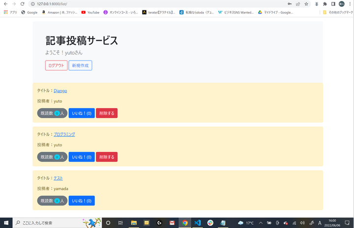 Djangoを学習する過程で、記事投稿サイトを作成しました。 機能としては、 ・アカウント管理(サインアップ、ログイン、ログアウト) ・CRUD ・いいね機能 ・既読機能 を実装しました。