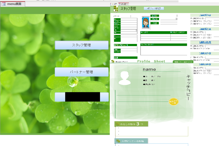 スタッフ・パートナー管理のシステムを構築。 スタッフ管理ページでは情報、経歴、強みを入力でき、「プロフ作成」ボタンをクリックするとプロフィールシートが自動的に作成できる。 非稼働者は表記されない設定にするなど、更新を随時実施中。