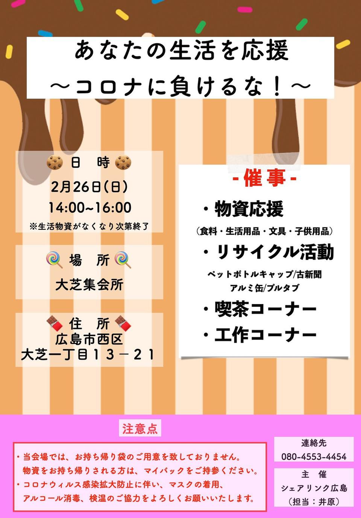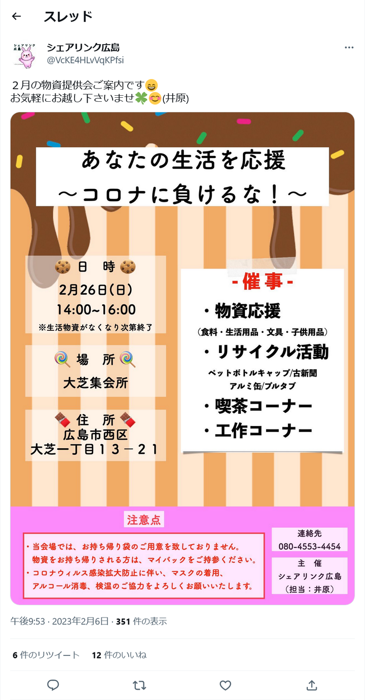 『令和五年(2023年)二月二十六日』に『大芝集会所』で『シェアリンク廣島』の『生活物資提供会』