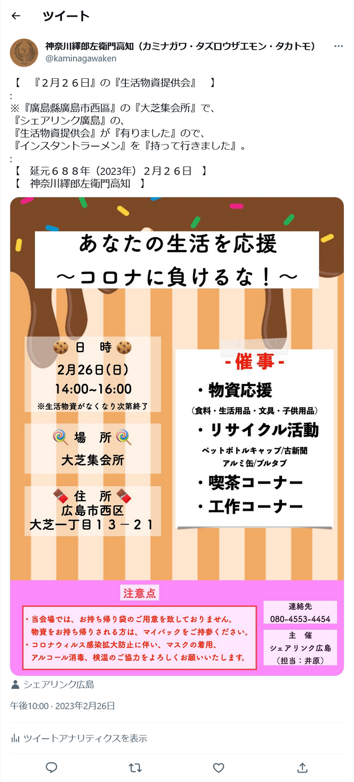 『令和五年(2023年)二月二十六日』は『廣島縣廣島市西區』の『大芝集会所』で『シェアリンク廣島』の『生活物資提供会』 / 『令和五年(2023年)二月二十六日』に『大芝集会所』で『シェアリンク廣島』の『生活物資提供会』
