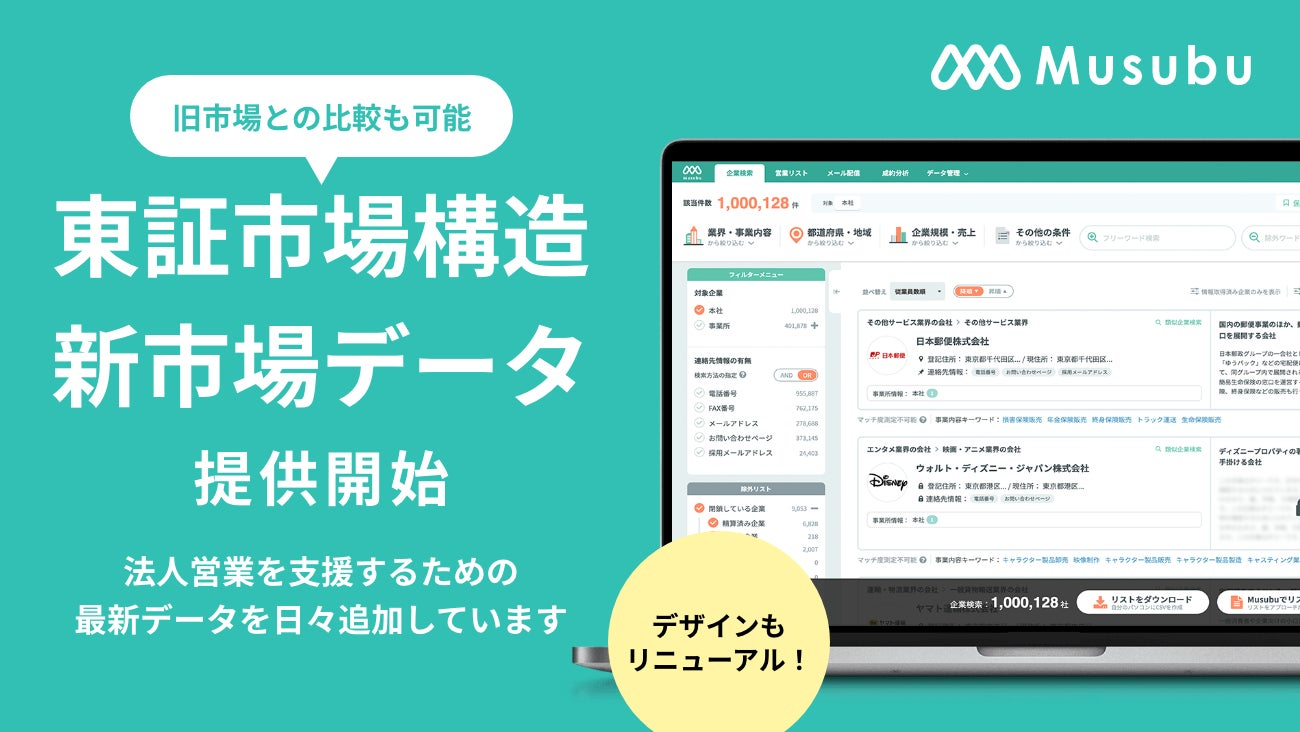 累計10万社導入・法人営業支援ソリューション「Musubu」(https://musubu.in/)を中心に、新商品開発・新規事業開発を担当しております。また、パートナー企業様へのデータ提供・協業 / DX支援を担当しておりますのでお気軽にご相談ください。