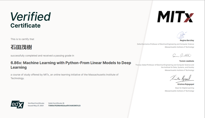 MITの大学院で行われる機械学習から深層学習までの講義を受講し、サポートベクターマシンなどを含む古典的な手法からDeep Neural Networkについて、数学のテスト、コーディングのテストを解いて試験に合格しました。 コーディングのレベル感はゼロから作るDeep Learningと同等で、数学のテストはPRMLの問題と同じくらいだと思います。