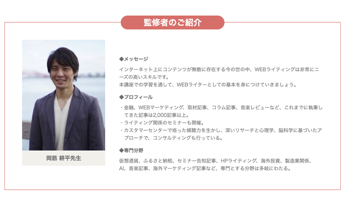 ユーキャンのWEBライター講座の監修を務めています。 具体的には、教材の作成、コース内容の考案、添削に携わっています。