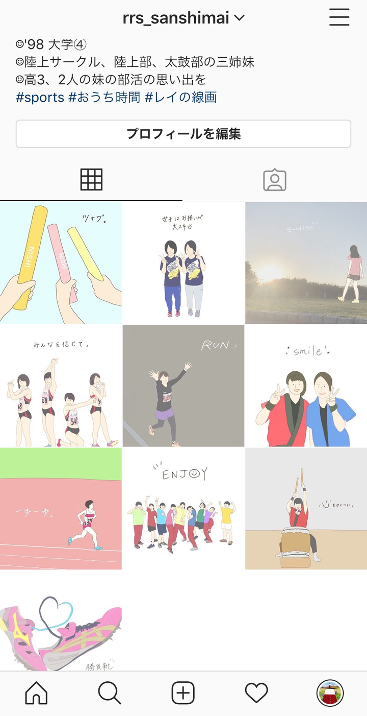 2020年、コロナの影響で高校最後の大会がなくなってしまった双子の妹(陸上部、太鼓部)を少しでも元気づけようと書き始めたイラストです。かわいも絵やジャニーズやYouTuberなどのアーティストのイラストはInstagramに溢れていますが、あまりスポーツに特化したものは見かけないなと思い、公開を始めました。