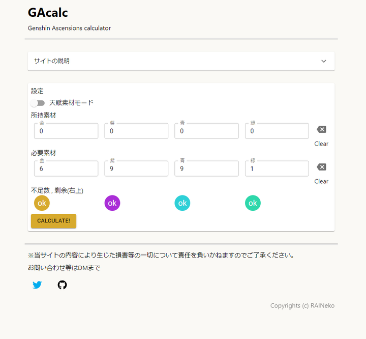 原神というゲームアプリのアイテムの個数を計算できるアプリです。 ReactとMaterial-UIを使って作りました。