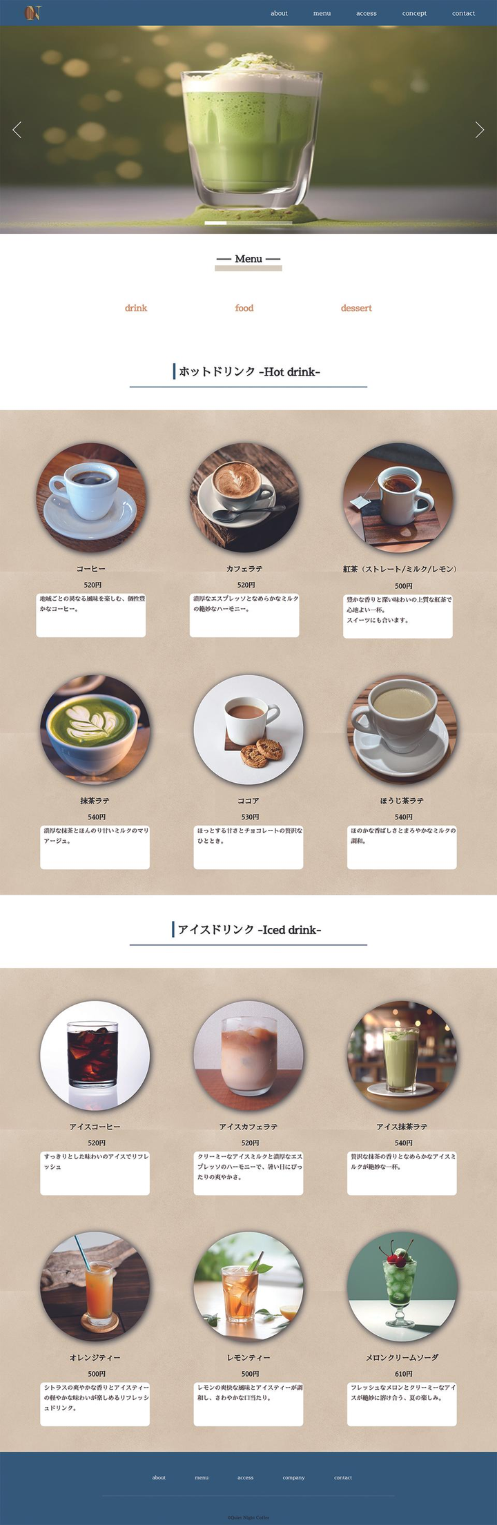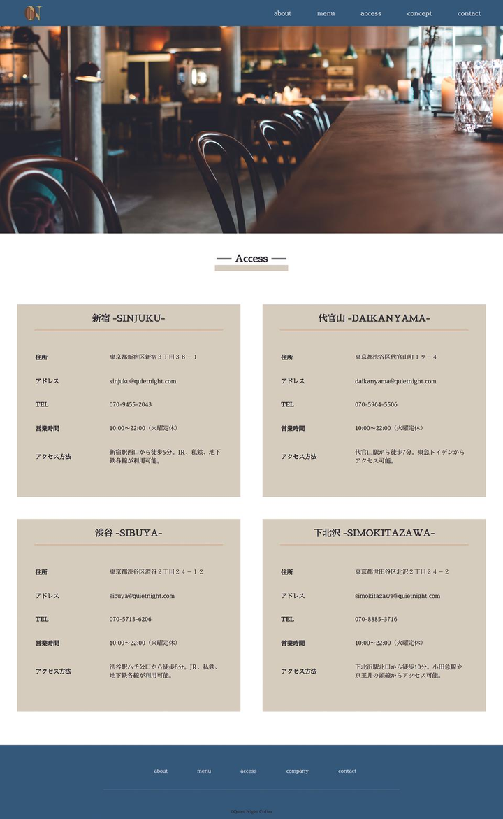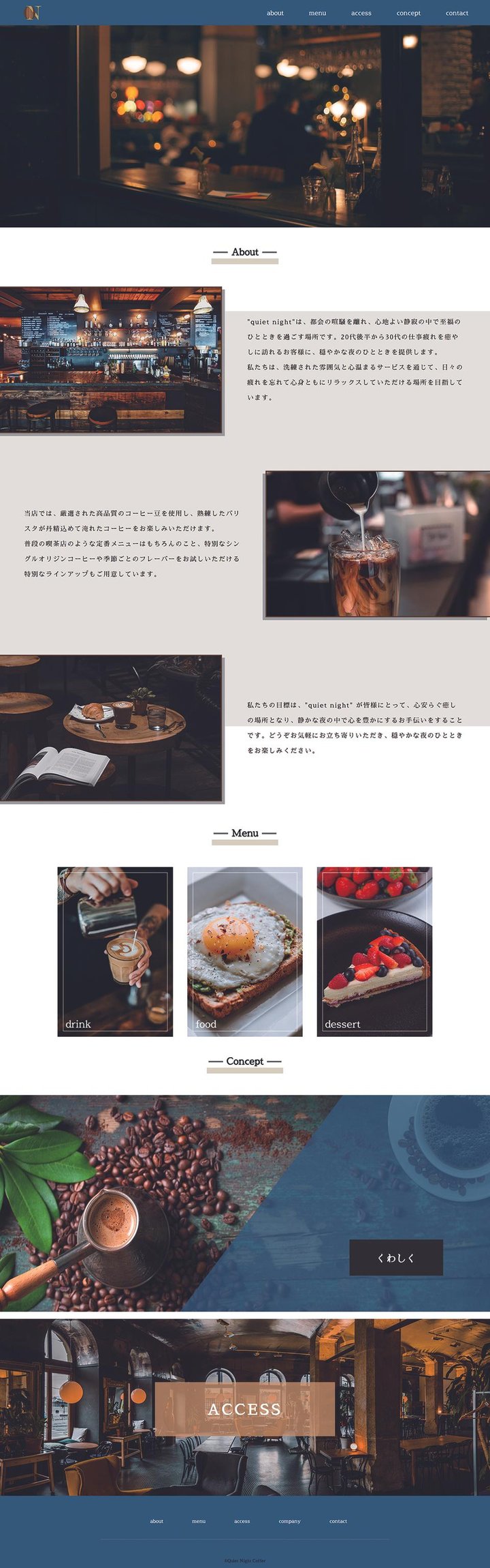 ・担当範囲 :企画(1時間)、デザイン(13時間)、コード(18時間) ・使用アプリ:Figuma、Visual Studio Code ・コンセプト:この店は、都会の喧騒を離れ、心地よい静寂の中で至福のひとときを過ごす 場所です。20代後半から30代の仕事疲れを癒し訪れるお客様に、穏やかな夜のひとときを提 供します。 コンセプト: 静かな夜の癒しと上質なコーヒー この店は、都会の喧騒を離れ、心地よい静寂の中で至福のひとときを過ごす場所です。20代後半から30代の仕事疲れを癒し訪れるお客様に、穏やかな夜のひとときを提供します。