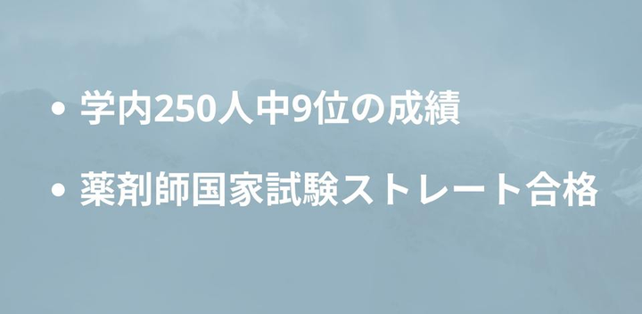 薬剤師を志し薬学部へ入学。6年次の国家試験模試では学内250人中9位の成績を収め、ストレートで国家試験へ合格しました。 焼肉チェーン店でのアルバイトではキッチンのリーダーを担当。店長からの信頼を得て、店長不在時のマネジメントや在庫管理を任されていました。