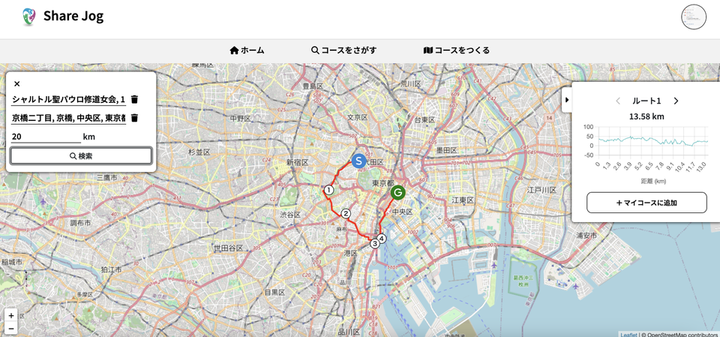 Github▶︎ https://github.com/RIKU-SEINO/share-jog/tree/main ンニングやジョギングを趣味とする方向けに、ランニングコースの検索と作成を支援するSNS形式のWEBアプリケーションです。 ランニングを趣味とする方にとって課題となるのが、「どこを走るか?」だと思います。 GoogleMapのような通常の経路案内サービスは、移動に最適なルートを提案するだけで、走行距離などを指定したジョギングルートを作成することはできません。 そこで、ランニングコースを自動的に作成することで、ユーザーがランニングコース作成にかける時間を削減するソフトウェアがあれば良いなと思い、「Share-Jog」の開発に至りました。 また、他のユーザーが走ったコースを検索・ブックマークすることもできるため、自分が今まで知らなかった素敵なランニングコースに出会うことができるかもしれません。