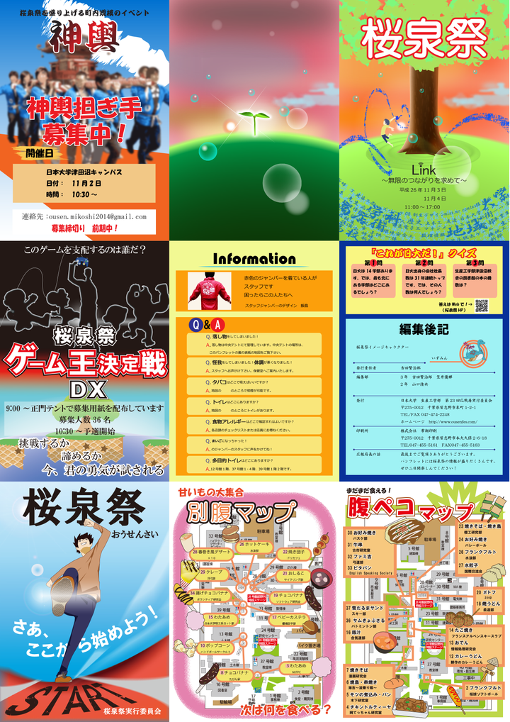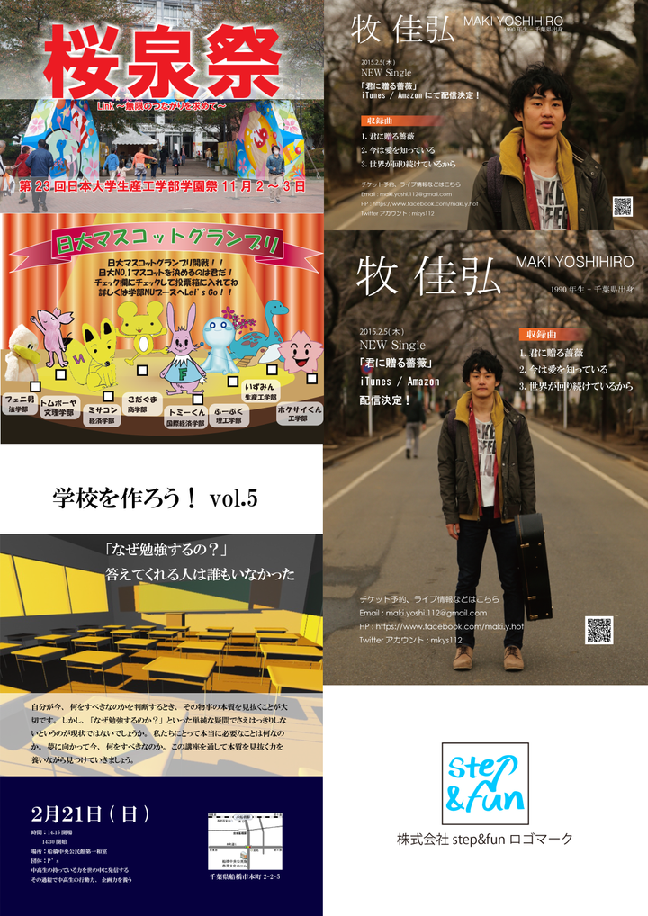 山口 陸央文化祭11枚、牧佳弘チラシ2枚、ロゴ1つ、イベントチラシ1枚私は友人から依頼を受けてチラシや映像、装飾などを作っています。画像は文化祭実行委員会で製作したものと友人からの依頼で製作したものです。