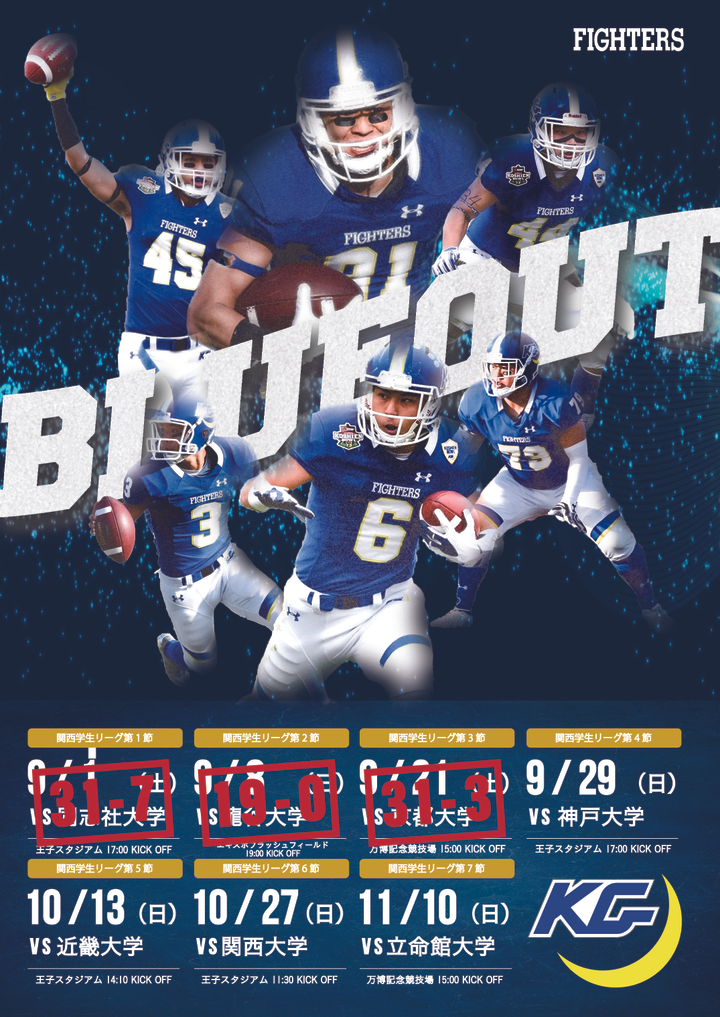 関西学院大学アメリカンフットボール部FIGHTERSの試合告知用のフライヤーです。今年度のスローガンである「BLUEOUT」には、”青で敵を圧倒して飲み込む。観客、スタンドを青く染め上げる” という思いが込められています。また、社会人戦への勝利に向け、学生を圧倒する力を身に付けることを目標として掲げています。以上のことに則り、まずはフライヤーを手に取った人が圧倒されるようなデザインを目指しました。選手の存在感を第一に、所々テクスチャーを活用しながら全体を青く染め上げています。また、全体のバランスや配置、各人のサイズ感などを調整しつつ、選手に動きを持たせるにはどうするかということに注力しました。