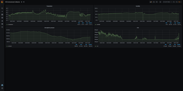 BME280 と MH-Z19C と M5Stamp Pico Mate で温度・湿度・気圧・二酸化炭素濃度を計測するシステムを作りました。 計測したデータは InfluxDB に保存し、Grafana で可視化できるようにしました。