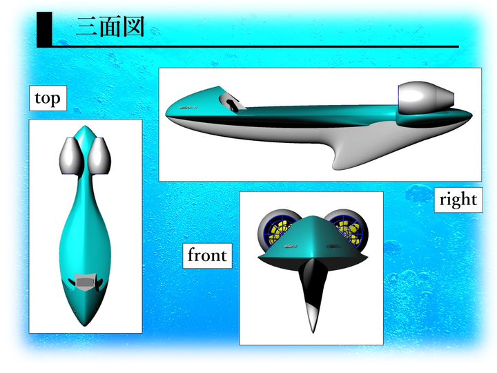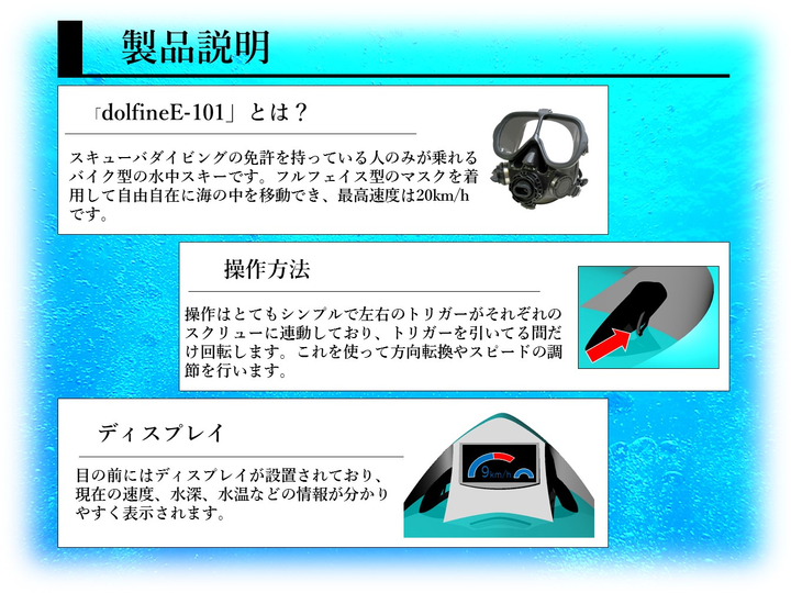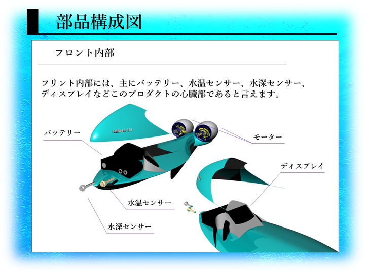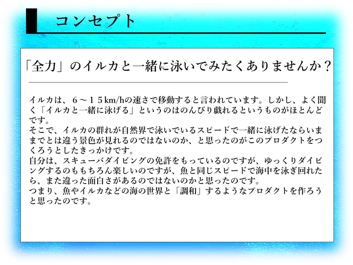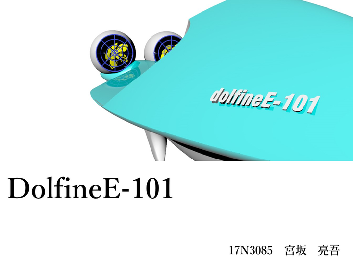 初めに大変お恥ずかしいのですが、dolphinの綴を間違えてることをここで訂正させていただきます。 こちらの作品は、大学一年生最後の大きな課題で、「3Dモデリング」という授業の最終課題でテーマは「人と自然の調和」です。このテーマに沿って機能、形、美しさなどインダストリアルデザインとしてゼロからデザインしてみんなの前でプレゼンをするという課題でした。私が何故これをデザインしようと思ったのかと言いますと、私は大学でスキューバーダイビングのサークルに所属していて海中でゆっくり泳ぐのもいいんですけど、イルカのように素早く海と一体になって泳いでみたいと思ったのが発想の出発点で、機能や操作方法は、少し似たようなものがあったのでそちらを参考にしていき、ボデイの形はイルカの体の形を参考にして考えていきました。 使用ソフト:3DCAD Rhinoceros