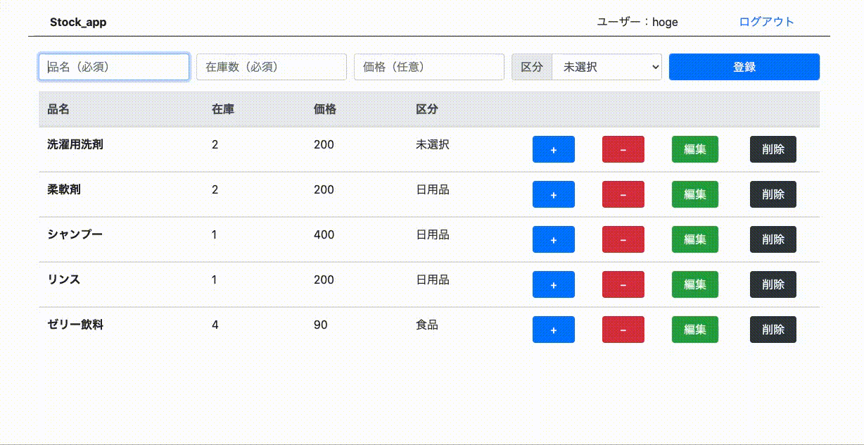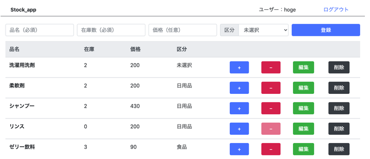 日用品、食品の在庫管理アプリ Basic認証ID:admin Basic認証PASS:2323 テストID:hoge@example.com テストPASS:hoge12
