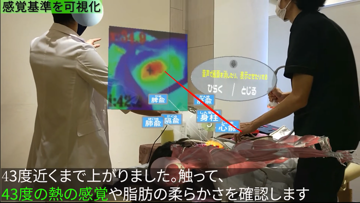 HoloLens2を使用して、エステの施術者がどこを施術して温度がどれくらい上がっているか指示するためにその情報を可視化したコンテンツ(Craftman<Beauty>と同様のもの) photonとAzureを使用して複数の施術者も体験できるようにしています。 こちらもXR総合展で出展し好評でした。