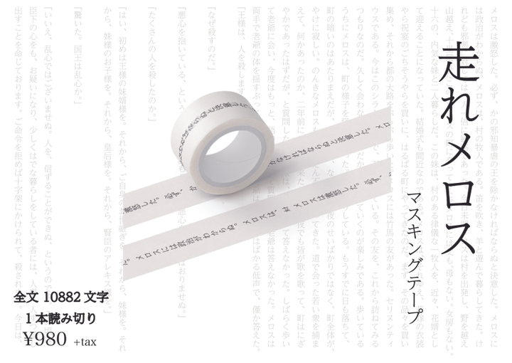 走れメロスを『縦書きで』『一行』で読めるマスキングテープ 好きな箇所を探しながら貼ることを楽しんで欲しいと思い制作 思いつきは、縦書きをうまく読めない自分の体験からで一行であれば読みやすいのではないかと考えたことから。