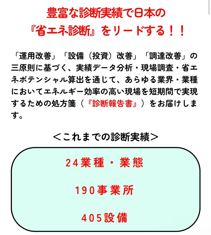 弛まない省エネを通じて 筋肉質の事業運営を目指す💡 「省エネ診断」→「省エネ監査」を通じてエネルギー効率の高い現場を実現し、経営品質を向上させることが、弊社のGoalsです! 「省エネ診断」は、その最初の第一歩です。