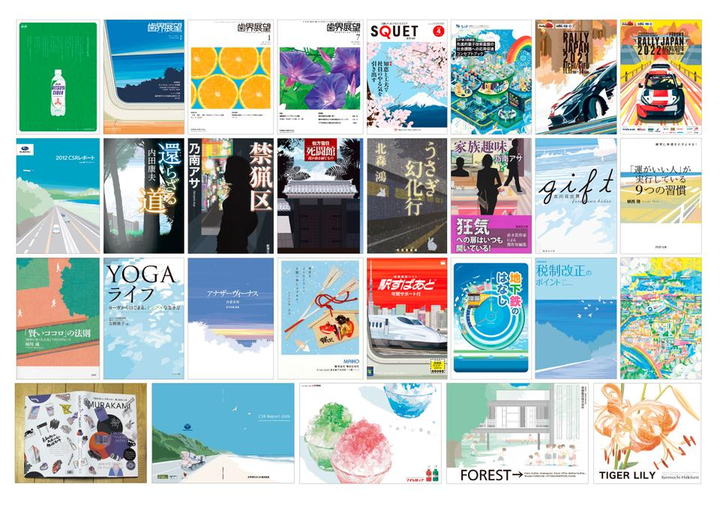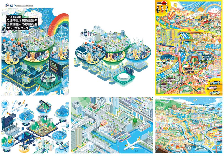 画像1:アイソメトリック図法を使った、テクニカルイラストレーションのクライアントワーク。 画像2:風景や様々なモチーフを表現したビジュアルでの広告や出版、書籍表紙などのクライアントワーク。