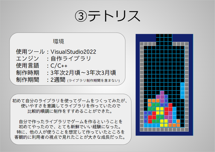 DirectX12で自作した2Dライブラリを使用しテトリスを作りました。 その際に意識した点などをまとめております。 (画像はポートフォリオの一部) Gitからダウンロード可能です。
