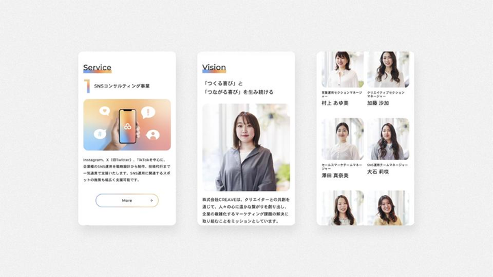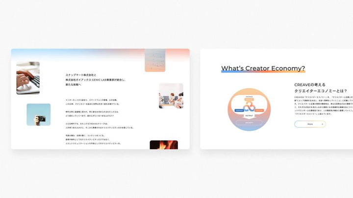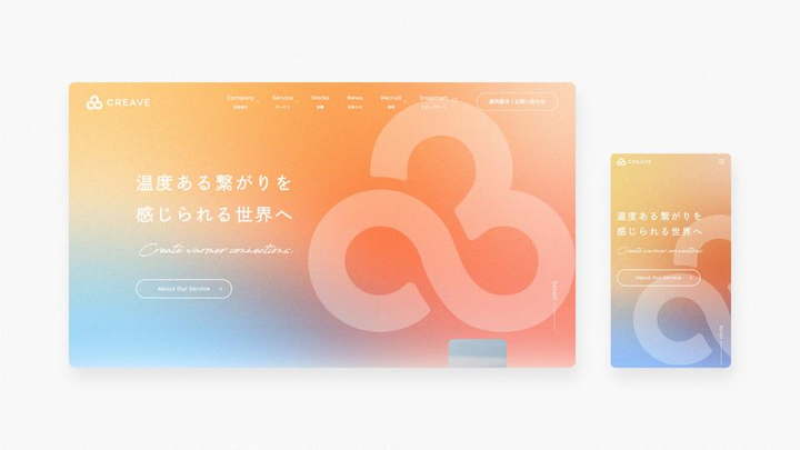 スナップマート株式会社と株式会社ガイアックス GENIC LAB事業部が統合し、新会社設立に伴い会社名策定、ロゴやサイト制作を行いました。CREAVEは "温度ある繋がりを感じられる世界へ"というミッションのもと、クリエイターと企業との共創を通じて、人々の心に温かな繋がりを創り出し、企業の複雑化するマーケティング課題の解決に取り組まれています。 社名は、CREATIVITY(クリエイティビティ)とSTOVE(ストーブ)からなる造語、「CREAVE」に決定。熱量を保つストーブが「社会へ接続させていく装置」として、会社という存在自体もストーブのように、人々があつまるような集合場所でありたいという思いが込められています。ロゴデザインは、CREAVEの軸となる3つのポイント「共創、温度、つながり」をキーワードに、CREAVE、CREATOR、COMPANYがつながり共創する様子を表しました。頭文字の“C”3つが繋がり、支え、集まる場となり、それぞれをイメージするカラーを混ぜたグラデーションの色味で炎を表現しています。